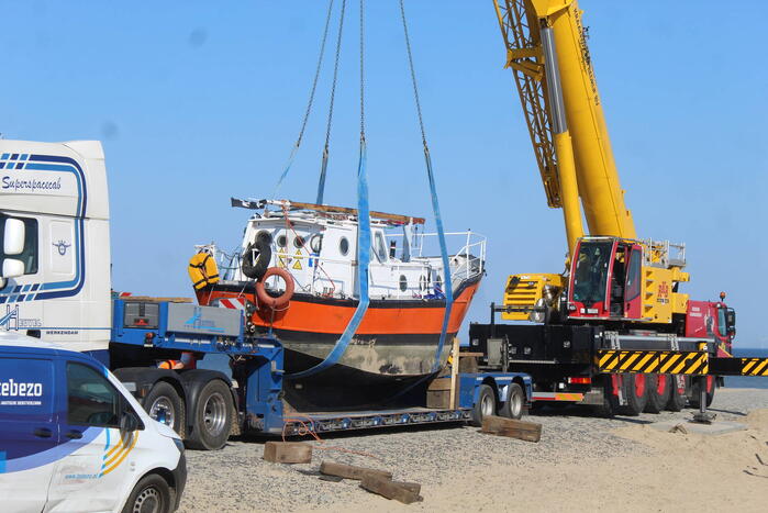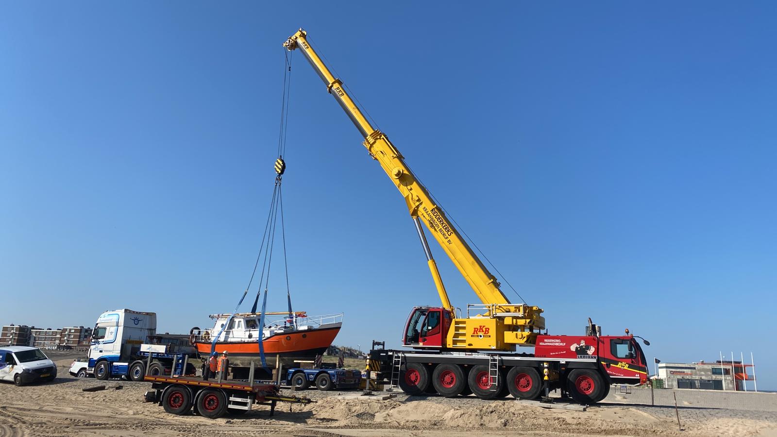 Met behulp van onze telescoopkraan werd het jacht voorzichtig van het strand getild en op een dieplader gelegd. 💪⚓
